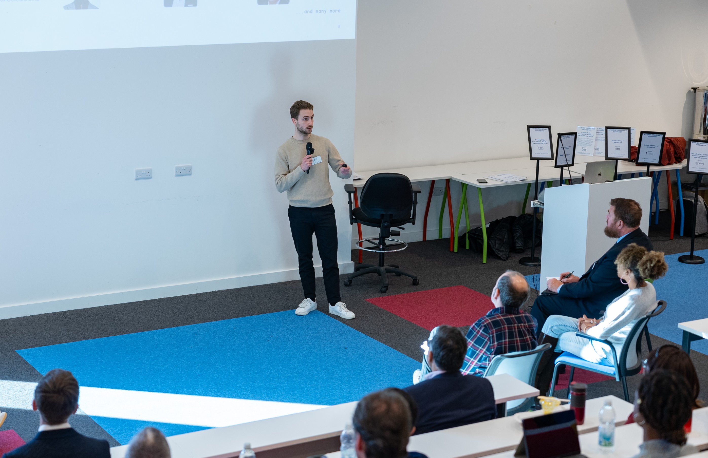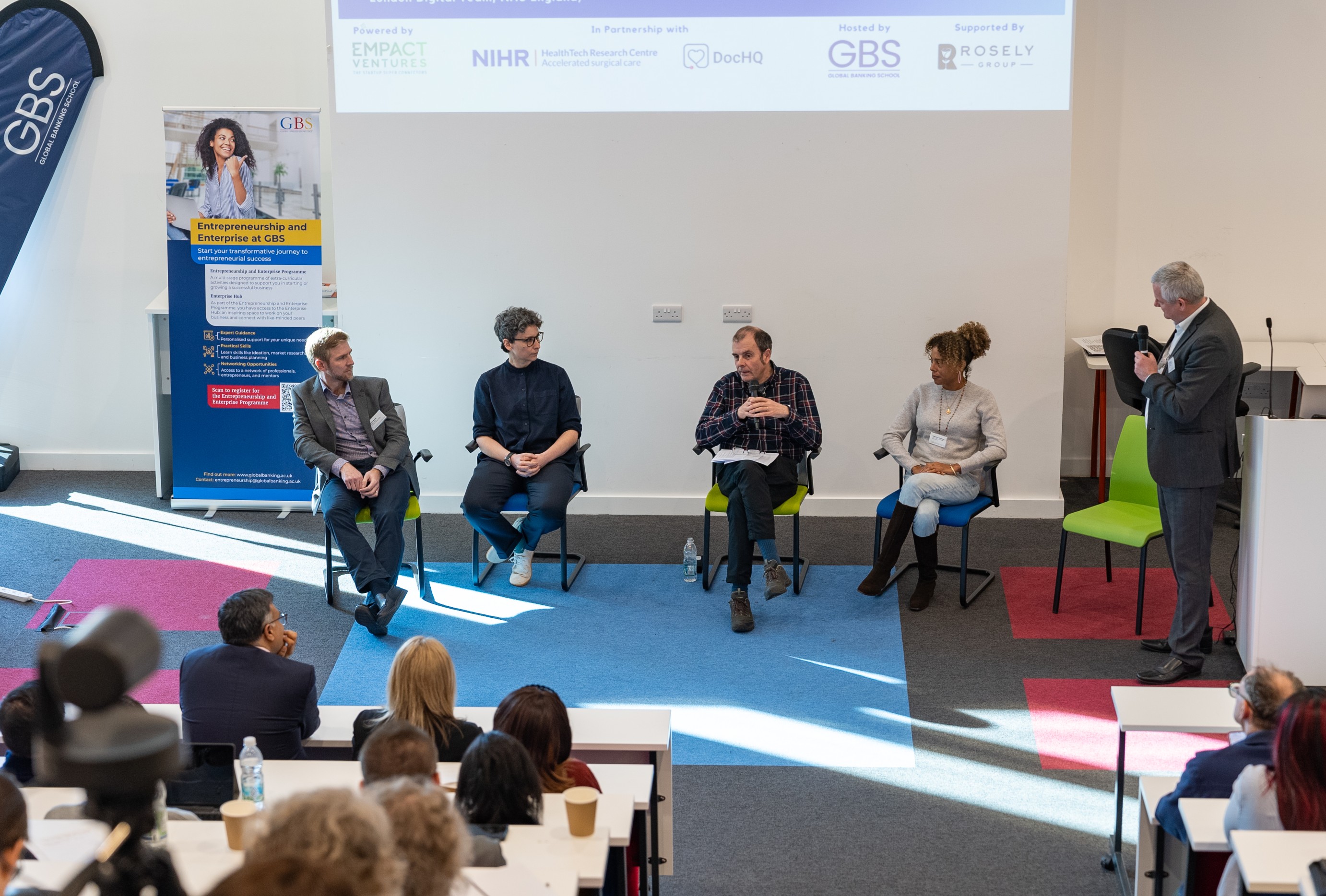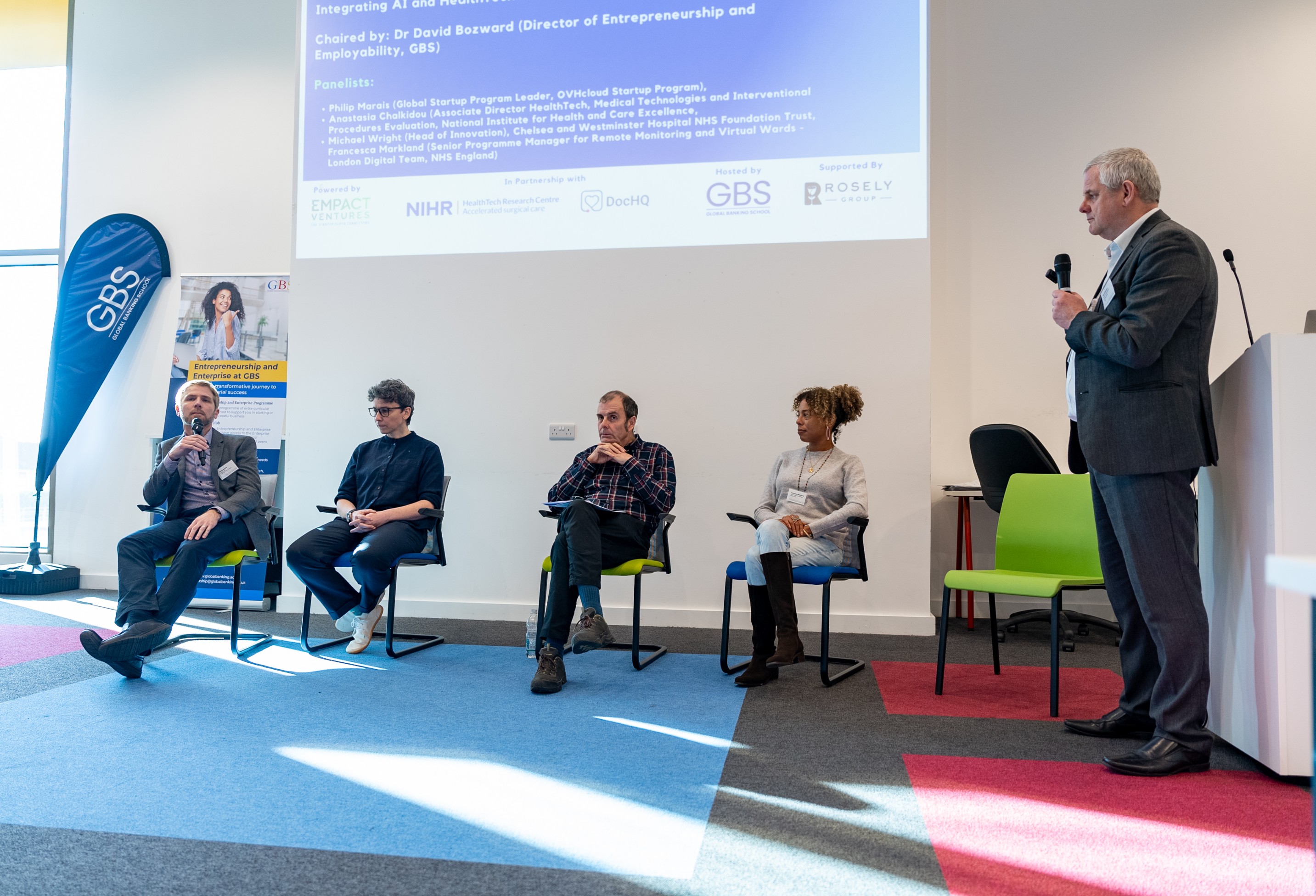The event commenced with a compelling roundtable discussion on “Integrating AI and HealthTech into Healthcare Systems.” This session was chaired by Dr David Bozward, Director of Entrepreneurship and Employability at GBS, and included esteemed panellists such as Anastasia Chalkidou, Associate Director of HealthTech at NICE; Francesca Markland, Senior Programme Manager for Remote Monitoring and Virtual Wards at NHS England; Michael Wright, Head of Innovation at Chelsea and Westminster Hospital NHS Foundation Trust; and Philip Marais, Global Leader of the OVHcloud Startup Program. Together, they explored the transformative potential of AI and emerging HealthTech solutions within modern healthcare systems.
